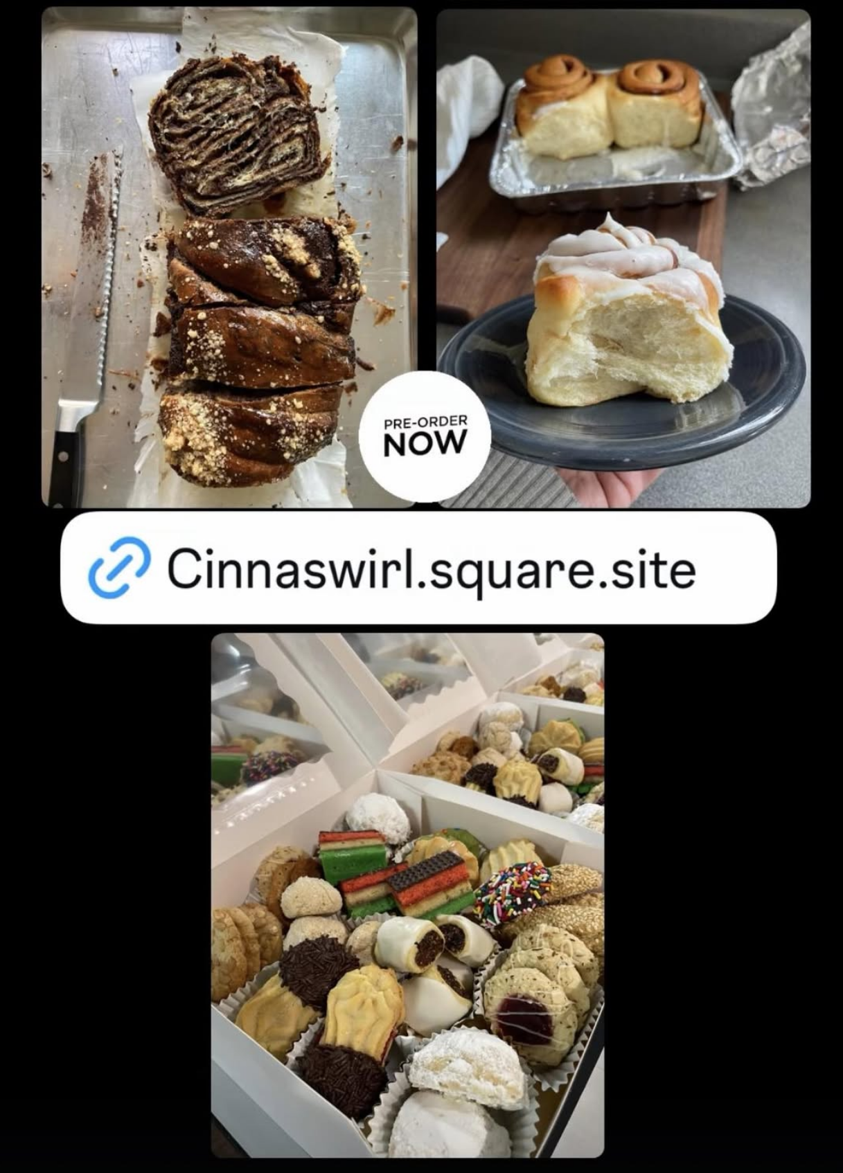 Pickup cinnamon rolls (individual or pans), chocolate babka (slice or loaf), banana bread (slice or loaf), and a black and white cookie! No sourdough Foccacia this week or next (Italian cookie boxes next Sat!). See you soon!!!