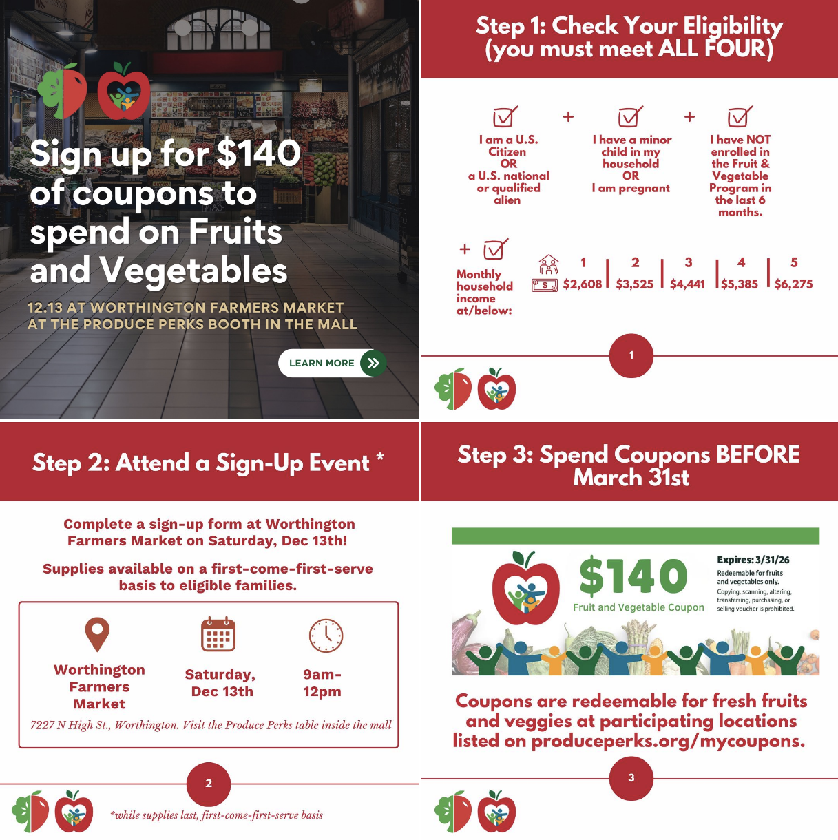 Visit with a Produce Perks representative at Booth #3 in front of the market information booth, complete a quick questionnaire to determine eligibility, receive $140 in coupons to spend on fresh produce through 3/31/26!