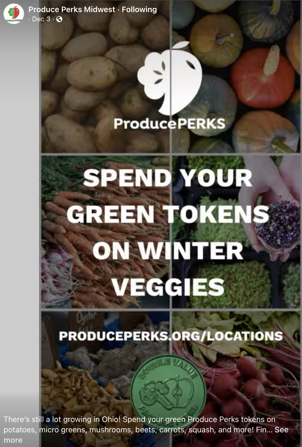 There’s still a lot growing in Ohio! Spend your green Produce Perks tokens on potatoes, micro greens, mushrooms, beets, carrots, squash, and more! Find participating farmers’ markets at produceperks.org/locations.