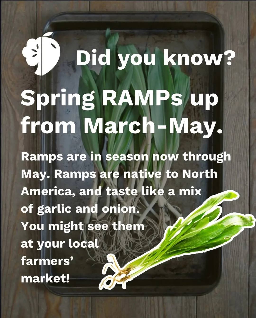 Ramps, also known as wild leeks, are native to North America and are in-season for a brief period in spring. This garlicky-oniony vegetable is a quintessential spring vegetable; you might see ramps at a farmers’ market near you! Visit producePERKS.org for locations near you.