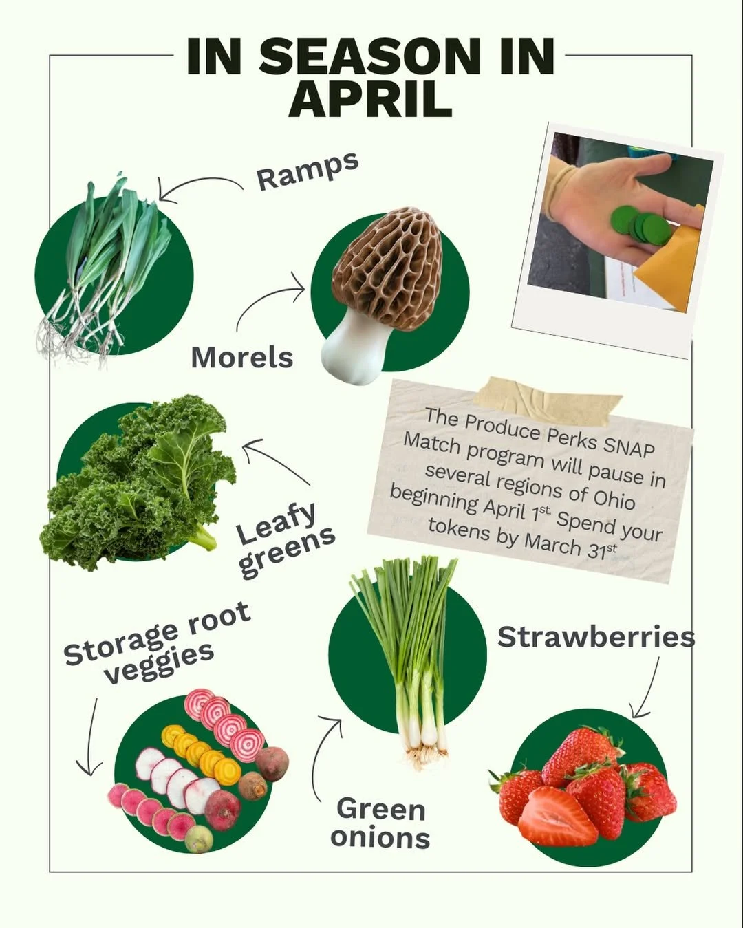 In April, produce with very short seasons starts growing. You might start seeing morels, ramps, and strawberries at your local farmers’ markets. Visit producePERKS.org for locations near you.