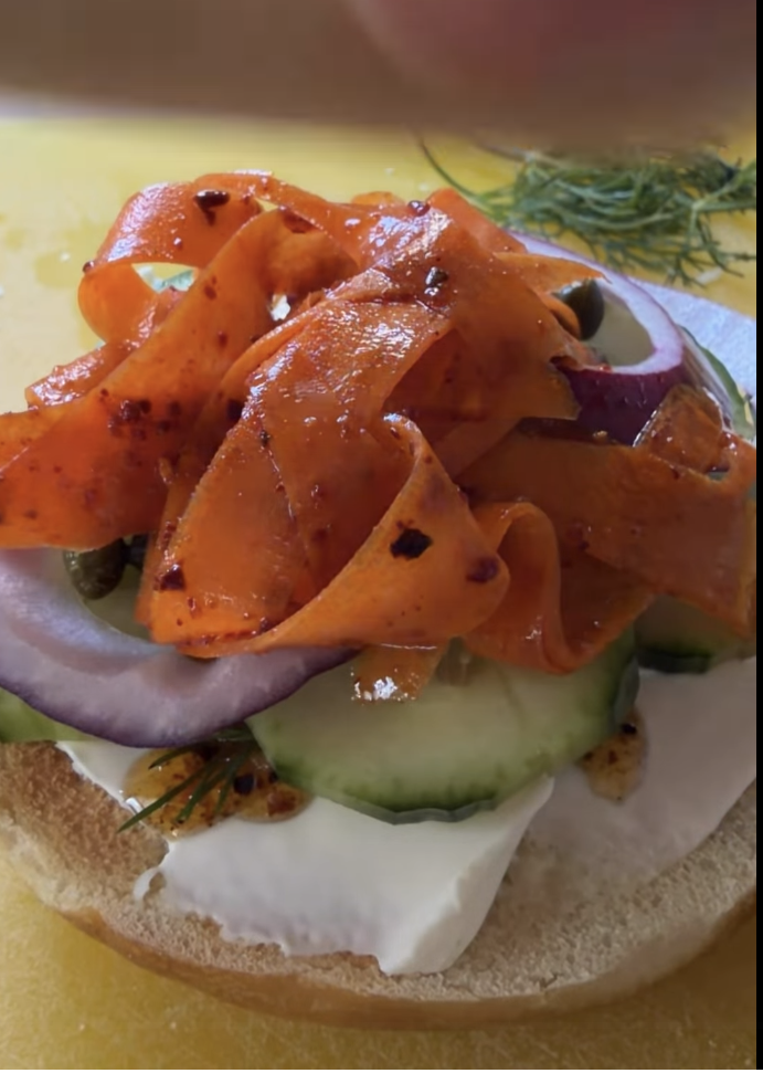Got these amazing bagels and REALLY wanted to make lox so that I could put La Sirena on it (she’s a mermaid, she is MADE to go with things from the sea!), BUT I had no salmon. So I made carrot lox marinated in La Madre. And when I tell you that the fact that it has taken me this long to get those two ladies (La Madre and La Sirena) together is a shame…..I mean IT IS A SHAME! Oh man, new favorite couple!!