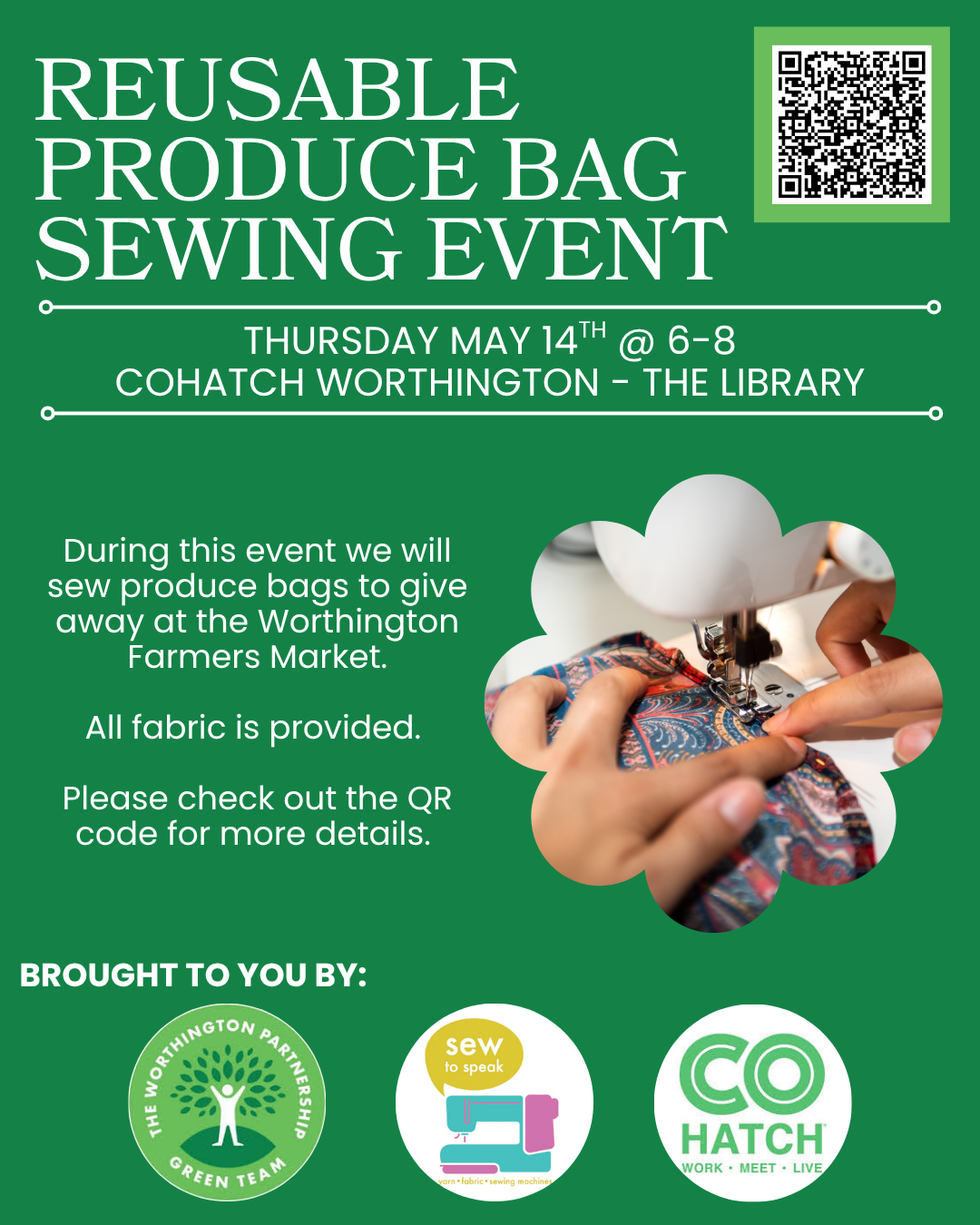 Reusable Produce Bag Sewing Event Thursday, May 14, 2026 6:00 PM 8:00 PM CoHatch Worthington - The Library (map) Google Calendar ICS Sign Up Sign Up